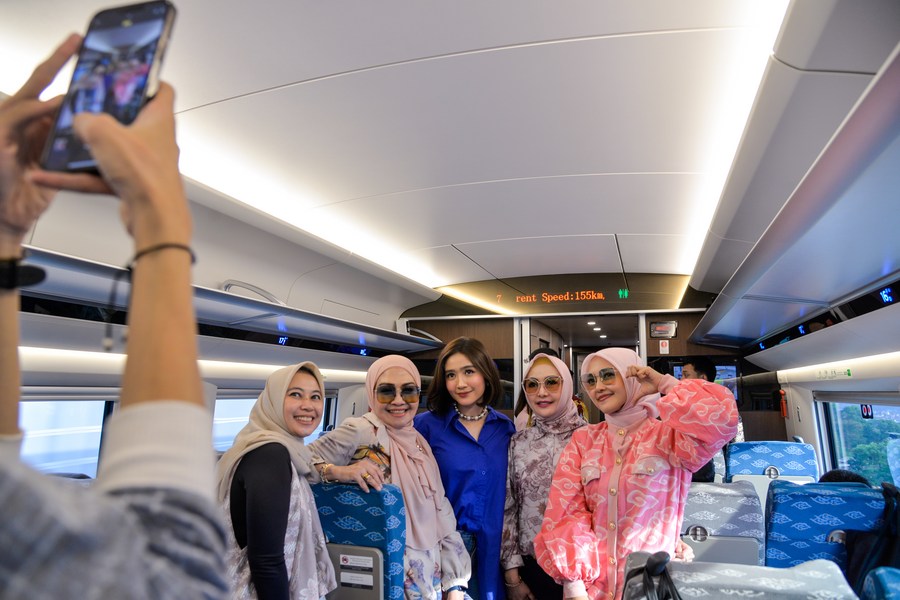 Passengers pose for photos in a carriage of a high-speed electrical multiple unit (EMU) train running on the Jakarta-Bandung High-Speed Railway in Indonesia, Oct. 17, 2023. (Xinhua/Xu Qin)