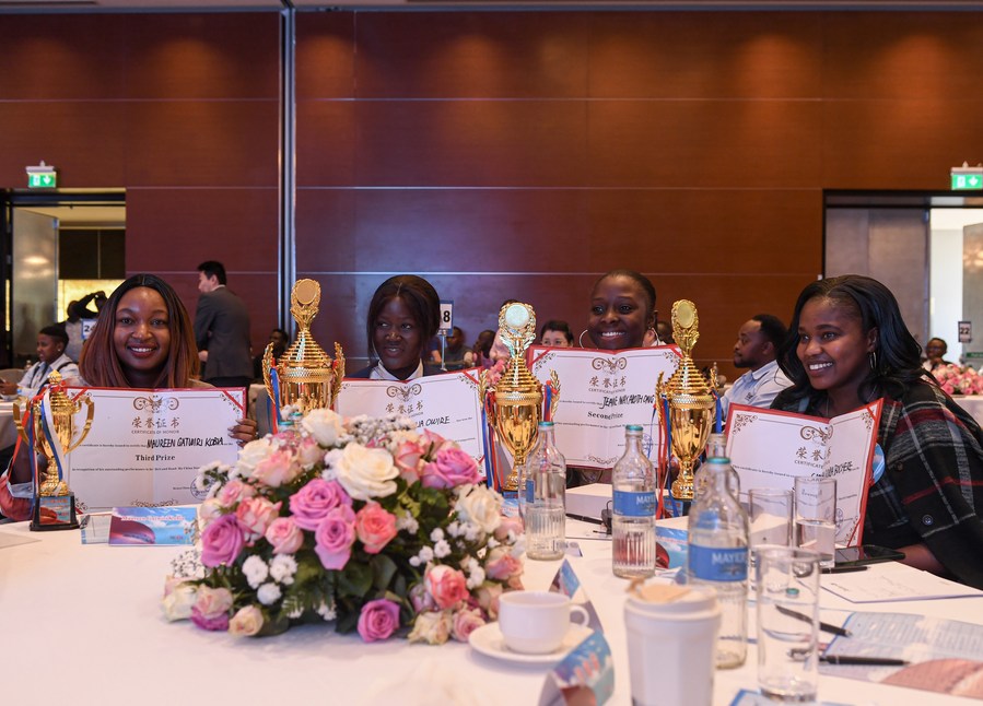 Winners show their certificates and trophies at an award ceremony of the Belt and Road "My Chinese Story" Speech Competition in Nairobi, Kenya, Oct. 13, 2023. (Xinhua/Li Yahui)