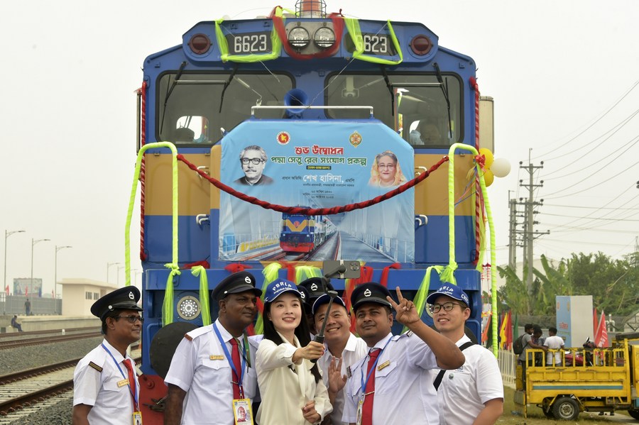 Staff members take selfies in front of a decorated train awaiting inaugural run at the Chinese-built Padma Bridge Rail Link Project (PBRLP) in Munshiganj, Bangladesh, Oct. 10, 2023. (Xinhua)
