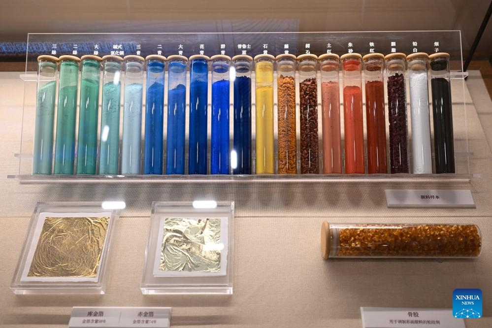 Painting materials are displayed during the exhibition titled "A Thousand-Year Legacy of Caihua: Inheritance and Innovation in Official-Style Chinese Architectural Polychrome Painting" held at the Palace Museum in Beijing, capital of China, May 26, 2025.