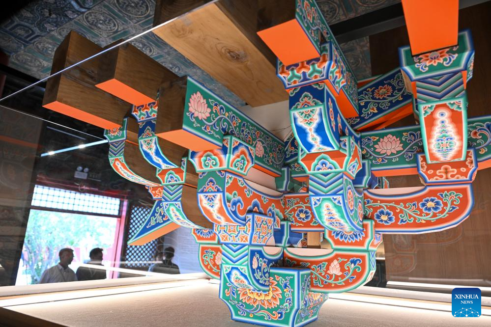An ancient architectural component decorated with Caihua is displayed during the exhibition titled "A Thousand-Year Legacy of Caihua: Inheritance and Innovation in Official-Style Chinese Architectural Polychrome Painting" held at the Palace Museum in Beijing, capital of China, May 26, 2025.