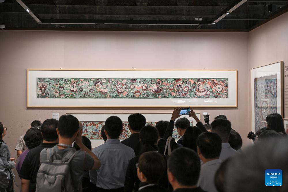 Guests view a copy of a Caihua painting from Mogao Grottoes in northwest China's Dunhuang during the exhibition titled "A Thousand-Year Legacy of Caihua: Inheritance and Innovation in Official-Style Chinese Architectural Polychrome Painting" held at the Palace Museum in Beijing, capital of China, May 26, 2025.