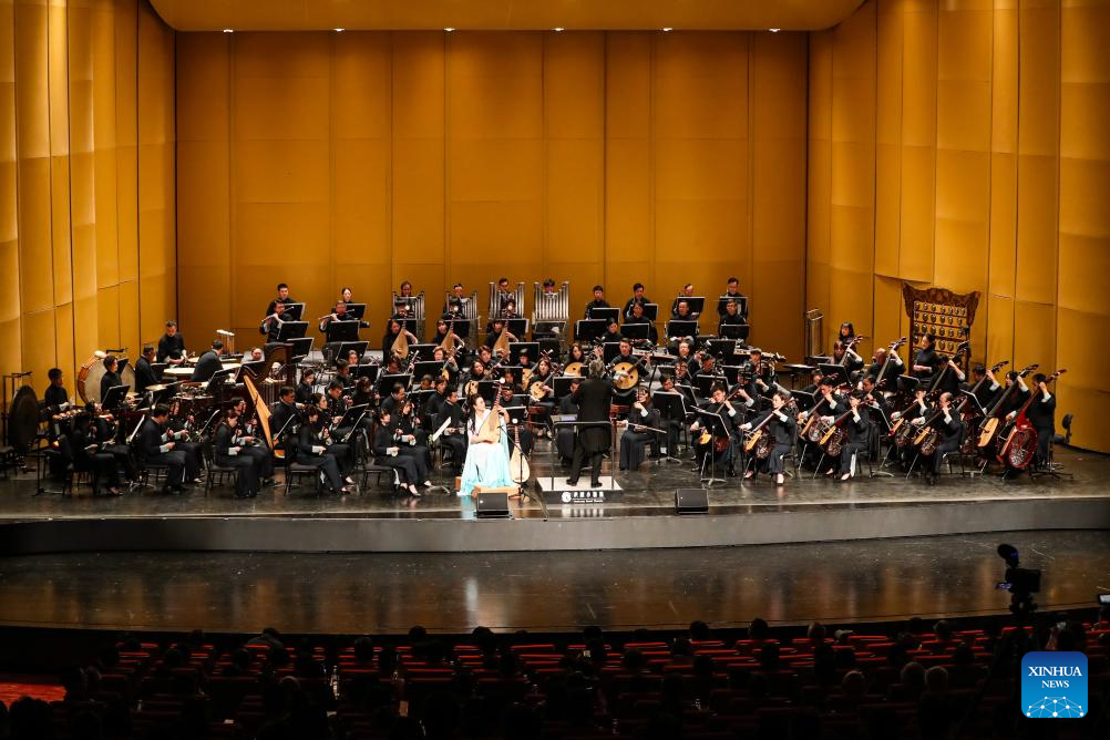 Musicians perform at a concert, part of the 8th Silk Road (Dunhuang) International Cultural Expo, in Dunhuang Grand Theatre in Dunhuang, northwest China's Gansu Province, Sept. 21, 2025. (Xinhua/Lang Bingbing)