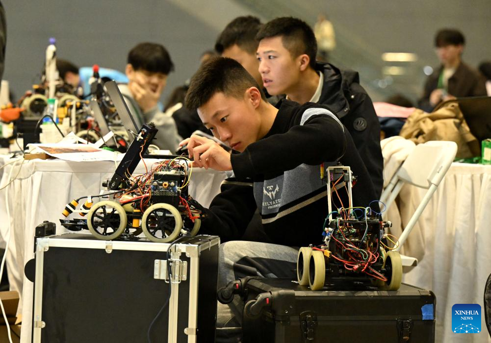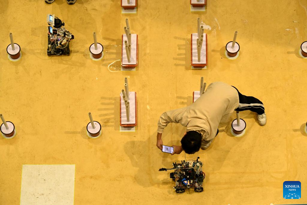A contestant debugs a robot before a game at the International Convention and Exhibition Center in Shijiazhuang, north China's Hebei Province, Oct. 17, 2025. The 2025 China Robot Competition and RoboCup China Open are held here from Friday to Sunday. (Photo by Chen Qibao/Xinhua)