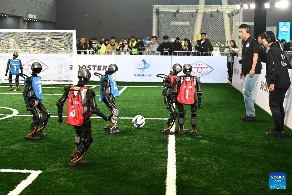 Robots are pictured during a football game at the International Convention and Exhibition Center in Shijiazhuang, north China's Hebei Province, Oct. 17, 2025. The 2025 China Robot Competition and RoboCup China Open are held here from Friday to Sunday. (Photo by Chen Qibao/Xinhua)
