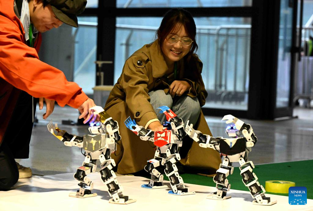 Contestants debug robots before a game at the International Convention and Exhibition Center in Shijiazhuang, north China's Hebei Province, Oct. 17, 2025. The 2025 China Robot Competition and RoboCup China Open are held here from Friday to Sunday. (Photo by Chen Qibao/Xinhua)