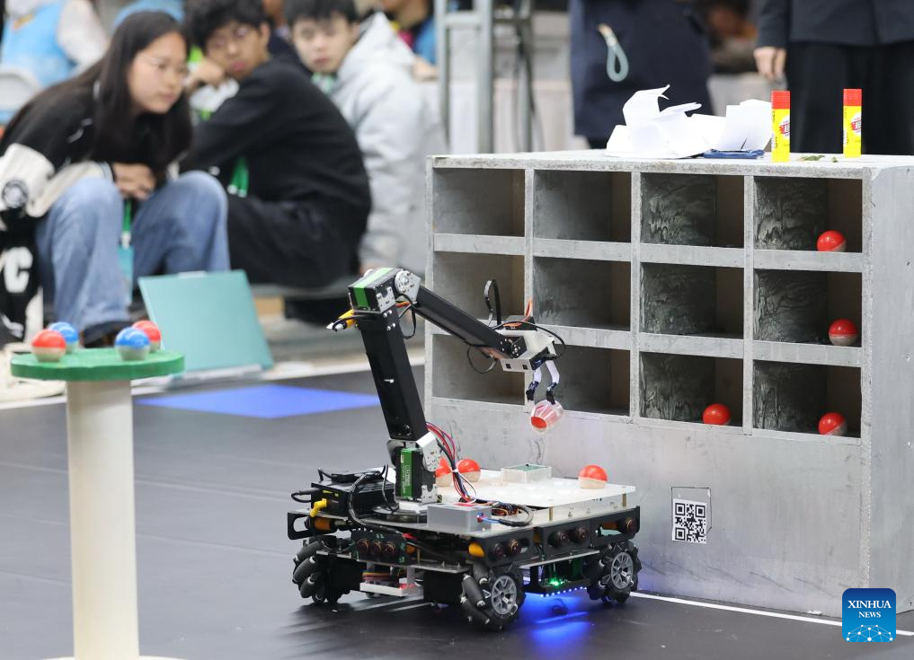 A drone challenge competition is held at the International Convention and Exhibition Center in Shijiazhuang, north China's Hebei Province, Oct. 17, 2025. The 2025 China Robot Competition and RoboCup China Open are held here from Friday to Sunday. (Photo by Chen Qibao/Xinhua)