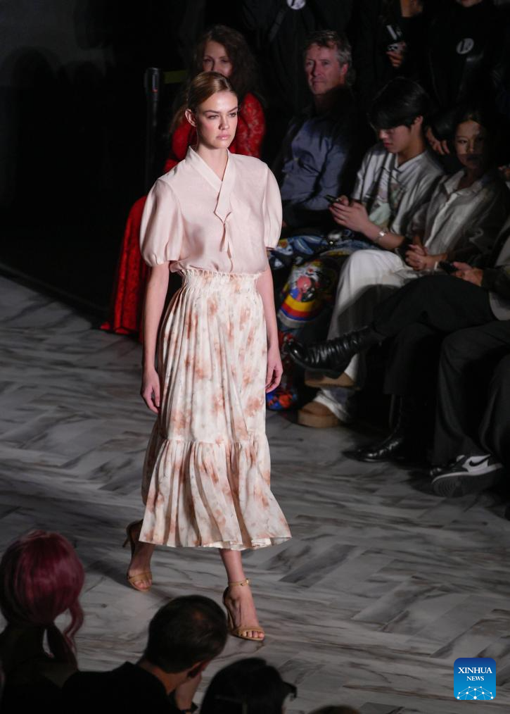 A model presents a creation from Japan's Valley's Lily during the Spring/Summer 2026 collections fashion show at Vancouver Fashion Week in Vancouver, British Columbia, Canada, Oct. 18, 2025. (Photo by Liang Sen/ Xinhua)