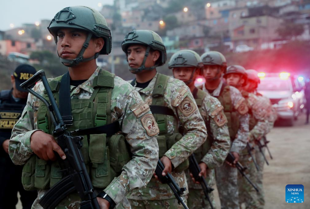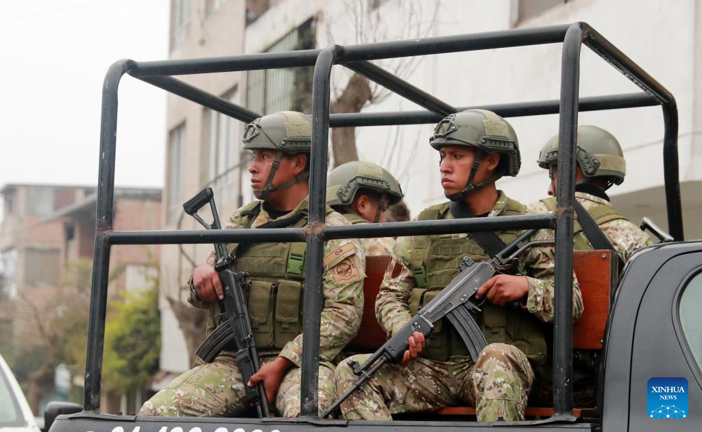 Members of the Peruvian Army patrol a street during the state of emergency in the district of Villa María del Triunfo, in southern Lima, Peru, Oct. 25, 2025. Peruvian President Jose Jeri declared on Tuesday a 30-day state of emergency for the capital Lima and the neighboring Callao region to tackle worsening public security. (Photo by Mariana Bazo/Xinhua)