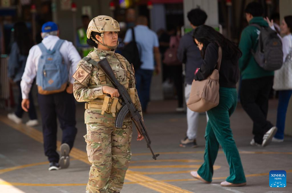 Service women patrol the La Cultura metro station in Lima, Peru, on Oct. 22, 2025. Peruvian President Jose Jeri declared on Tuesday a 30-day state of emergency for the capital Lima and the neighboring Callao region to tackle worsening public security. (Xinhua/Mariana Bazo)