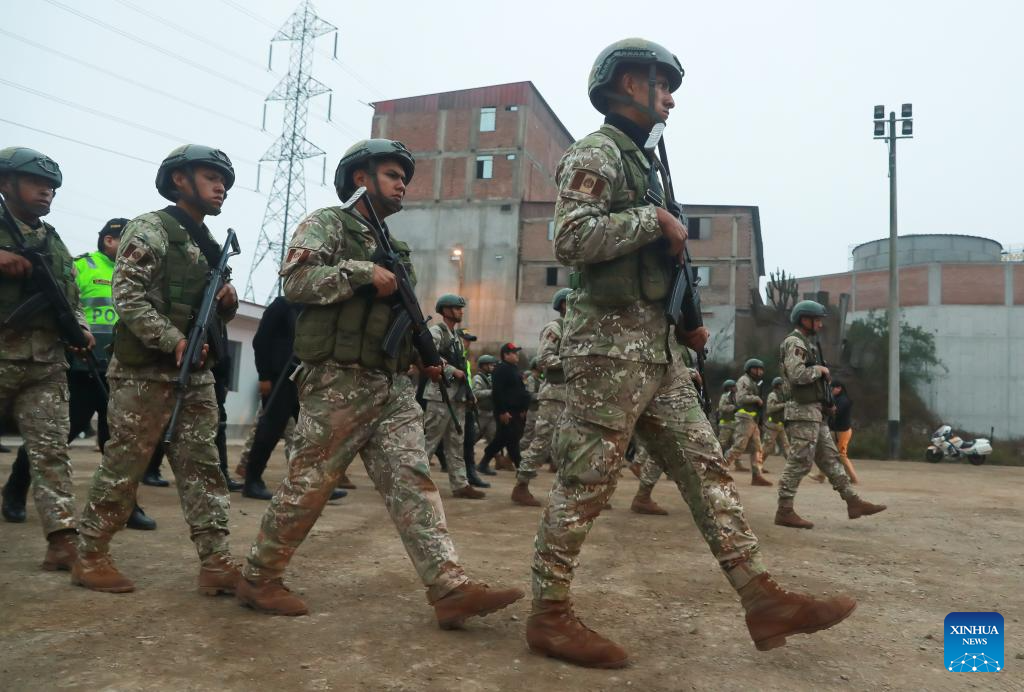 Members of the Peruvian Army line up in formation before patrolling the streets during the state of emergency in the district of Villa María del Triunfo, in southern Lima, Peru, Oct. 25, 2025. Peruvian President Jose Jeri declared on Tuesday a 30-day state of emergency for the capital Lima and the neighboring Callao region to tackle worsening public security. (Photo by Mariana Bazo/Xinhua)