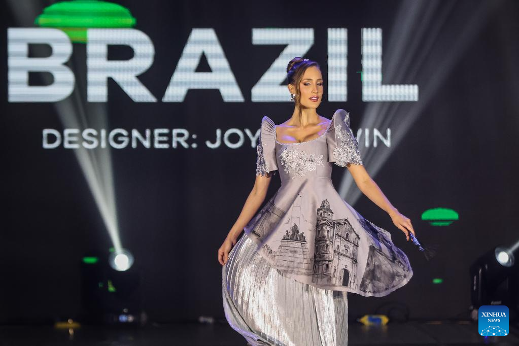 Laila Frizon of Brazil presents a creation during the Miss Earth 2025 Philippine Terno Fashion Show in Quezon City, the Philippines on Oct. 22, 2025. Miss Earth 2025 candidates from various countries participated in the fashion show featuring gowns made by Filipino designers in celebration of the beauty pageant's 25th anniversary. The coronation night of Miss Earth 2025 will be held on Nov. 5. (Xinhua/Rouelle Umali)