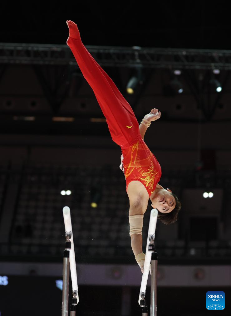 Zou Jingyuan of China prepares during the the Men's Parallel Bars Final at 53rd FIG Artistic Gymnastics World Championships in Jakarta, Indonesia, on Oct. 25, 2025. (Xinhua/Bai Xuefei)