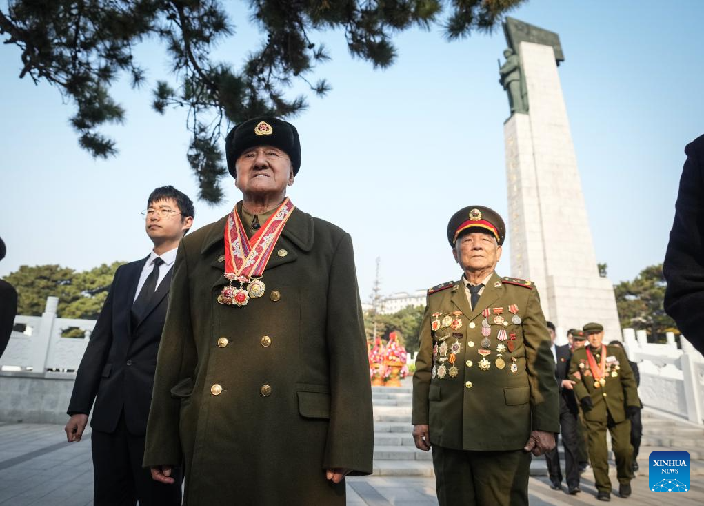 A flower baskets presenting ceremony is held at the Chinese People's Volunteers (CPV) martyrs' cemetery in Shenyang, northeast China's Liaoning Province, Oct. 25, 2025. Liaoning Province on Saturday held flower baskets presenting ceremonies in Shenyang and Dandong to commemorate the 75th anniversary of the CPV's entering the Democratic People's Republic of Korea to fight in the War to Resist U.S. Aggression and Aid Korea. (Xinhua/Pan Yulong)