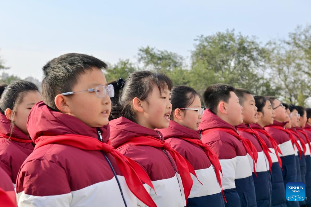 Students pay tribute to martyrs of the Chinese People's Volunteers (CPV) at the CPV martyrs' cemetery in Shenyang, northeast China's Liaoning Province, Oct. 25, 2025. Liaoning Province on Saturday held flower baskets presenting ceremonies in Shenyang and Dandong to commemorate the 75th anniversary of the CPV's entering the Democratic People's Republic of Korea to fight in the War to Resist U.S. Aggression and Aid Korea. (Xinhua/Pan Yulong)