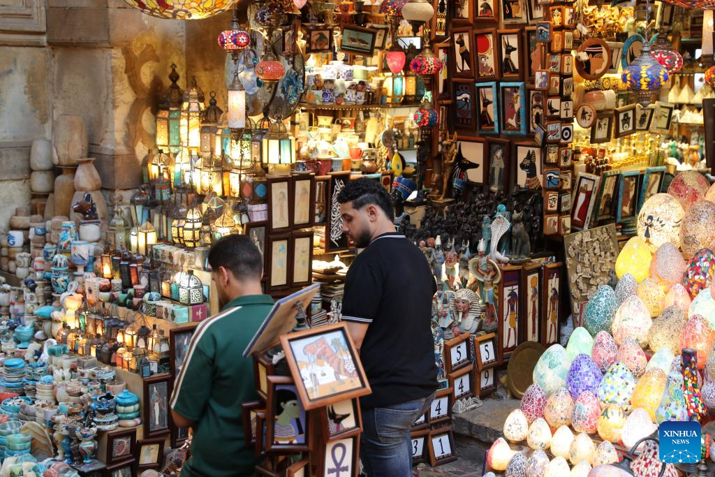 Tourists choose souvenirs at the Khan el-Khalili old market in Cairo, Egypt, on Oct. 22, 2025. Located in the heart of Cairo's old Islamic district, the centuries-old marketplace of Khan el-Khalili is considered one of the most popular tourist attractions in Egypt. (Xinhua/Sui Xiankai)