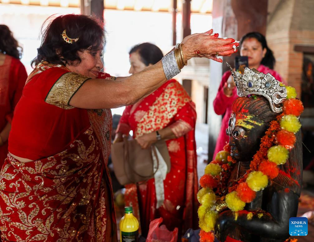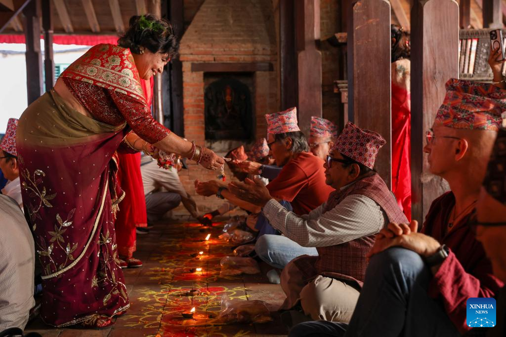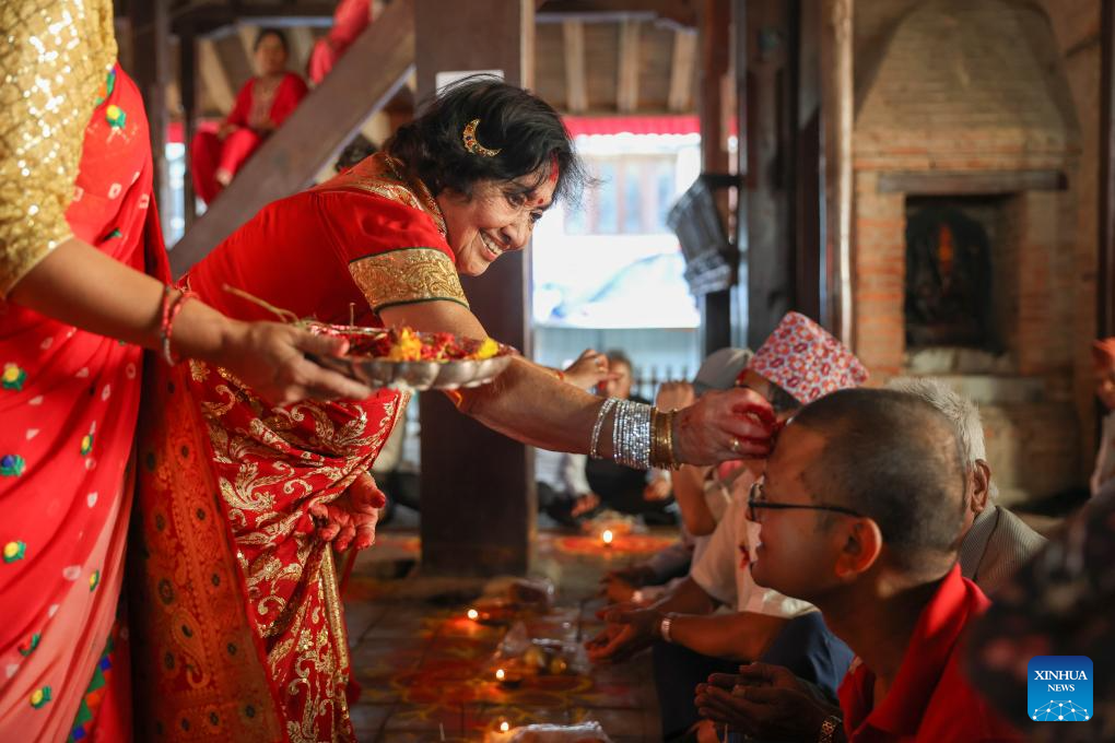 A woman performs a ritual for the mass Bhai Tika ceremony during the Tihar festival at Kasthamandap Temple in Kathmandu, Nepal, Oct. 23, 2025. The last day of Tihar, widely celebrated across Nepal, is known as Bhai Tika. On this day, sisters apply a tika on the foreheads of their brothers praying for their long life, good health and prosperity. (Photo by Sulav Shrestha/Xinhua)