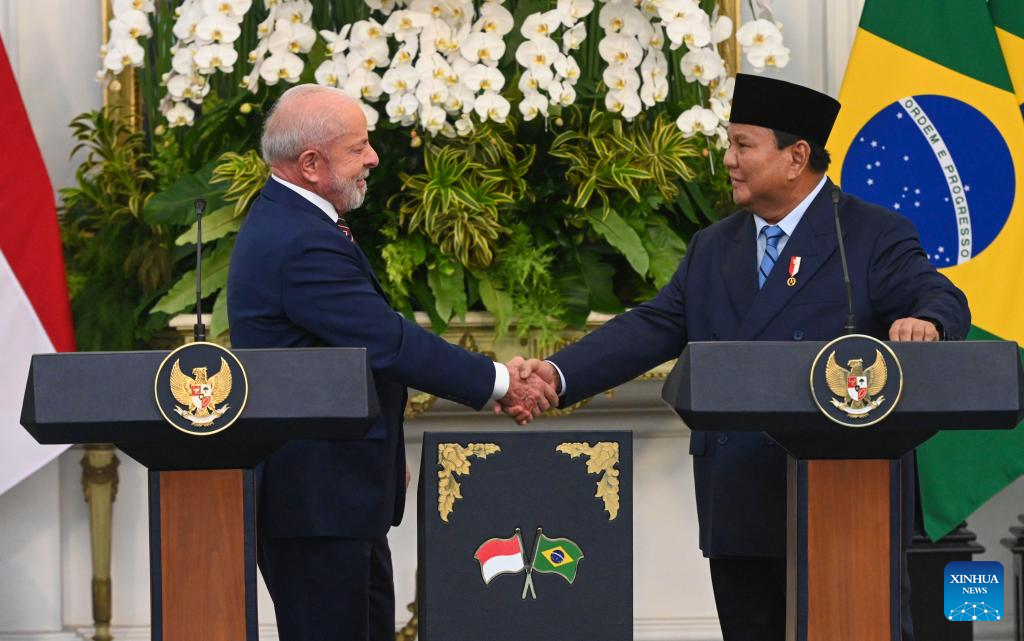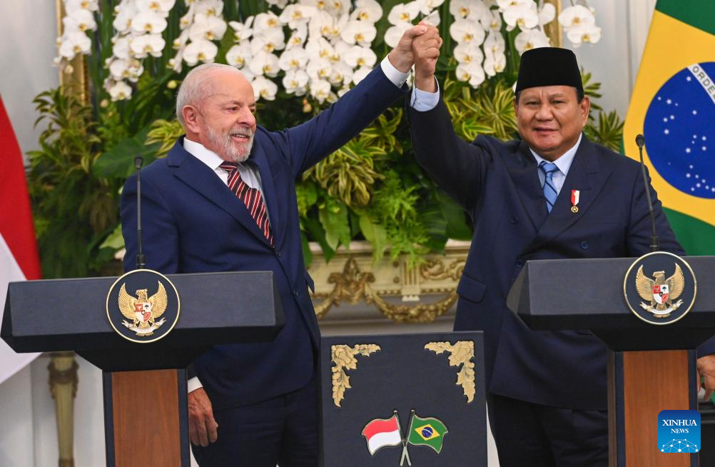 Indonesian President Prabowo Subianto (R) and Brazilian President Luiz Inacio Lula da Silva attend a joint press conference at Merdeka Palace in Jakarta, Indonesia, Oct. 23, 2025. (Photo by Zulkarnain/Xinhua)