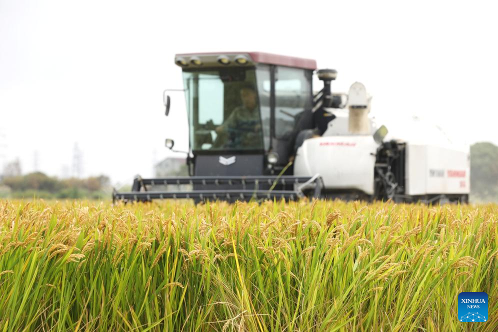 A farmer harvests paddy in Xinghuo Village of Fengqiao Town in Nanhu District of Jiaxing City, east China's Zhejiang Province, Oct. 22, 2025. (Photo by Jin Peng/Xinhua)