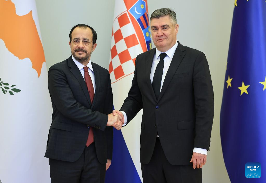 Croatian President Zoran Milanovic (R) meets with visiting Cypriot President Nikos Christodoulides in Zagreb, Croatia, Oct. 21, 2025. (Marko Prpic/PIXSELL via Xinhua)
