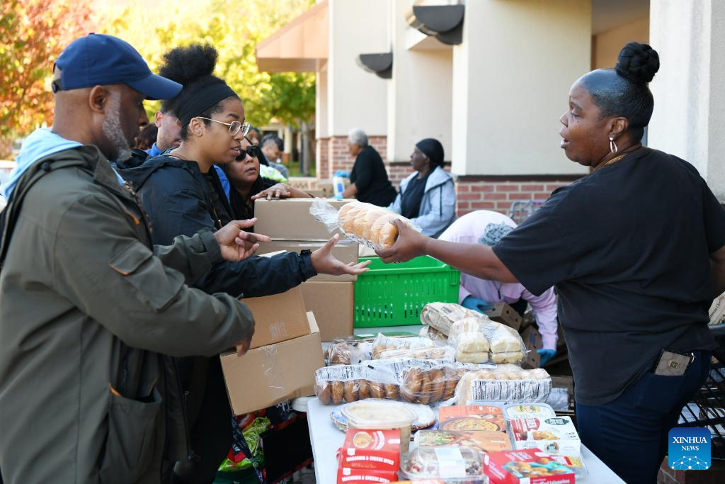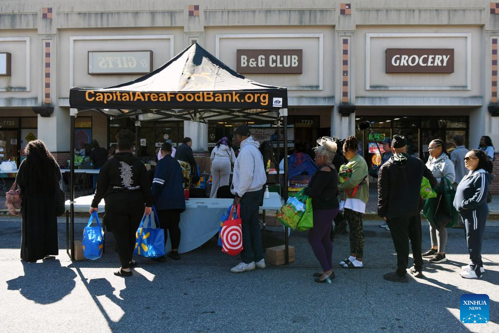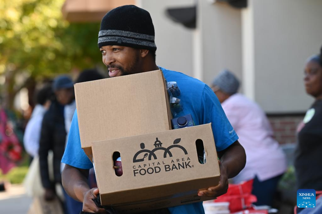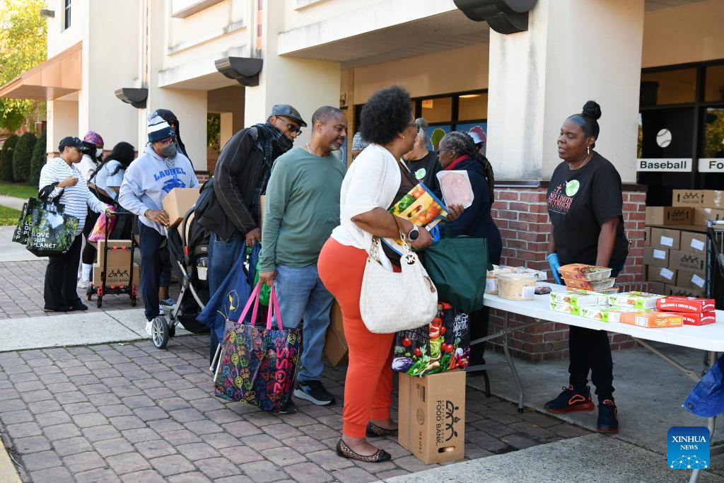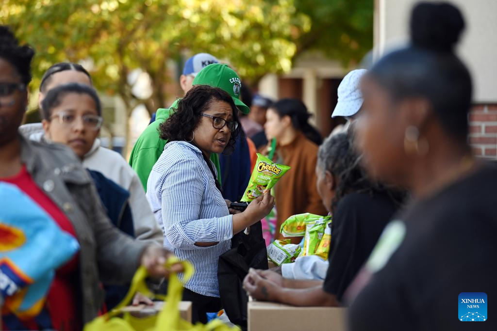 Federal employees and contractors receive food items during a free food distribution in Hyattsville, Maryland, the United States, on Oct. 21, 2025. Starting this week, the nonprofit Capital Area Food Bank started to provide special free food distributions to U.S. federal employees and contractors.