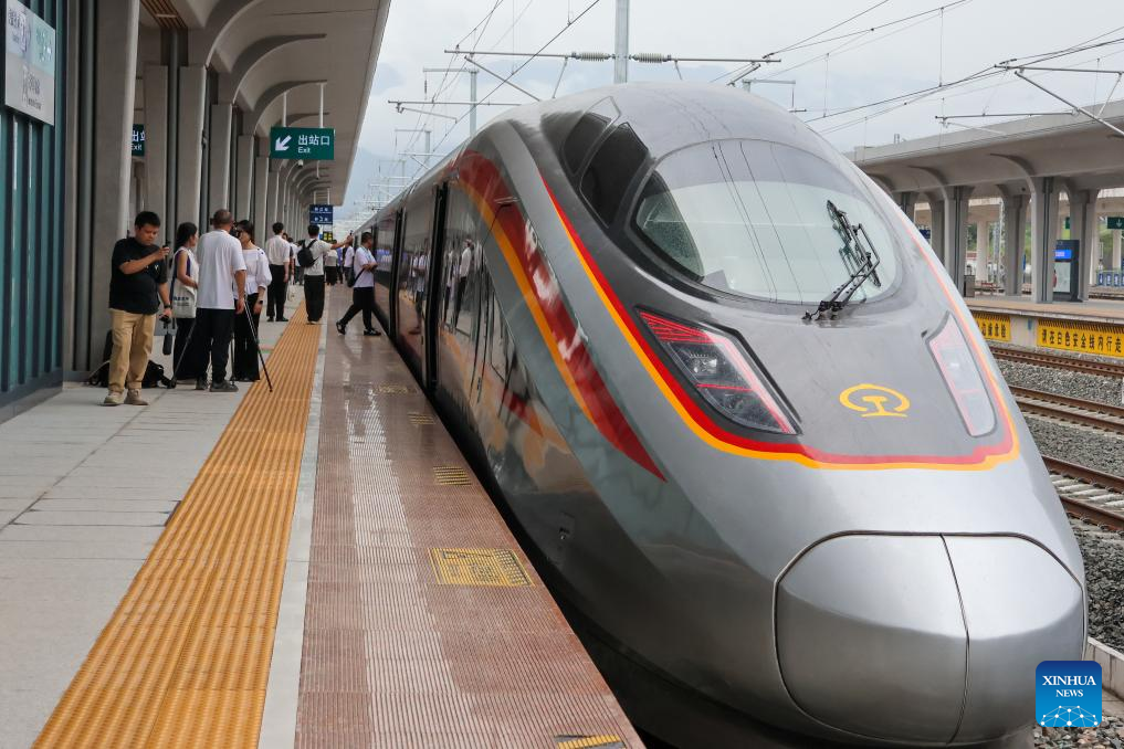 A high-speed train arrives at the Qianjiang Railway Station on the Chongqing section of the Chongqing-Xiamen high-speed railway, in southwest China's Chongqing, June 27, 2025.