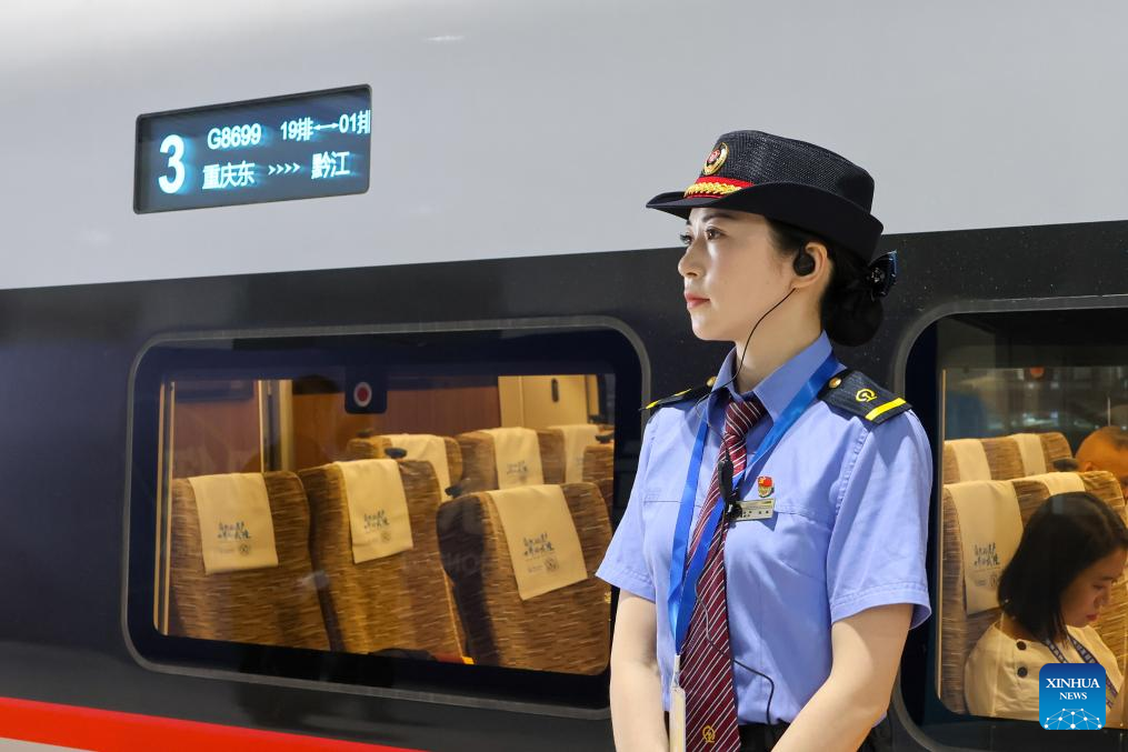 A high-speed train departed from the Chongqing East Railway Station bound for the Qianjiang Railway Station on Friday morning, inaugurating the 242-kilometer section of the Chongqing-Xiamen high-speed railway. Construction on this segment began in May 2020, and it features a maximum speed of 350 kilometers per hour and a daily operation capacity of up to 54 trains. (Photo by Ning Ke/Xinhua)