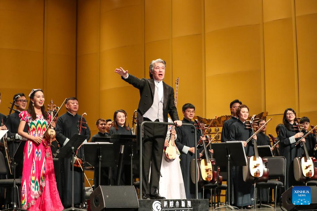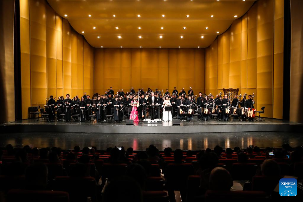 Musicians perform at a concert, part of the 8th Silk Road (Dunhuang) International Cultural Expo, in Dunhuang Grand Theatre in Dunhuang, northwest China's Gansu Province, Sept. 21, 2025. (Xinhua/Lang Bingbing)