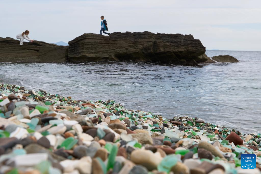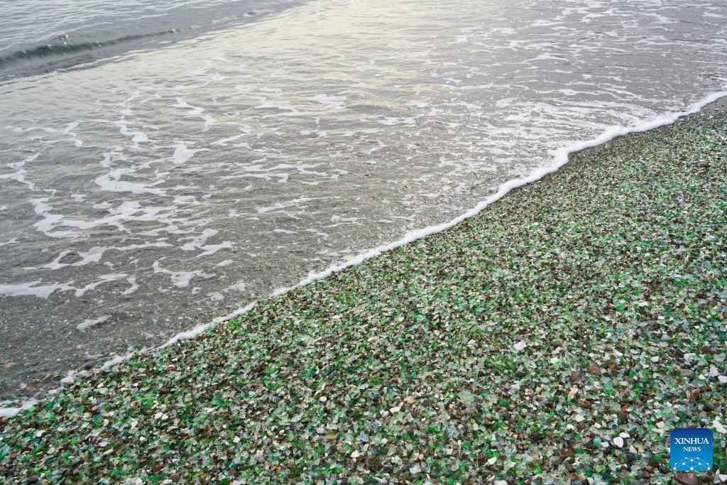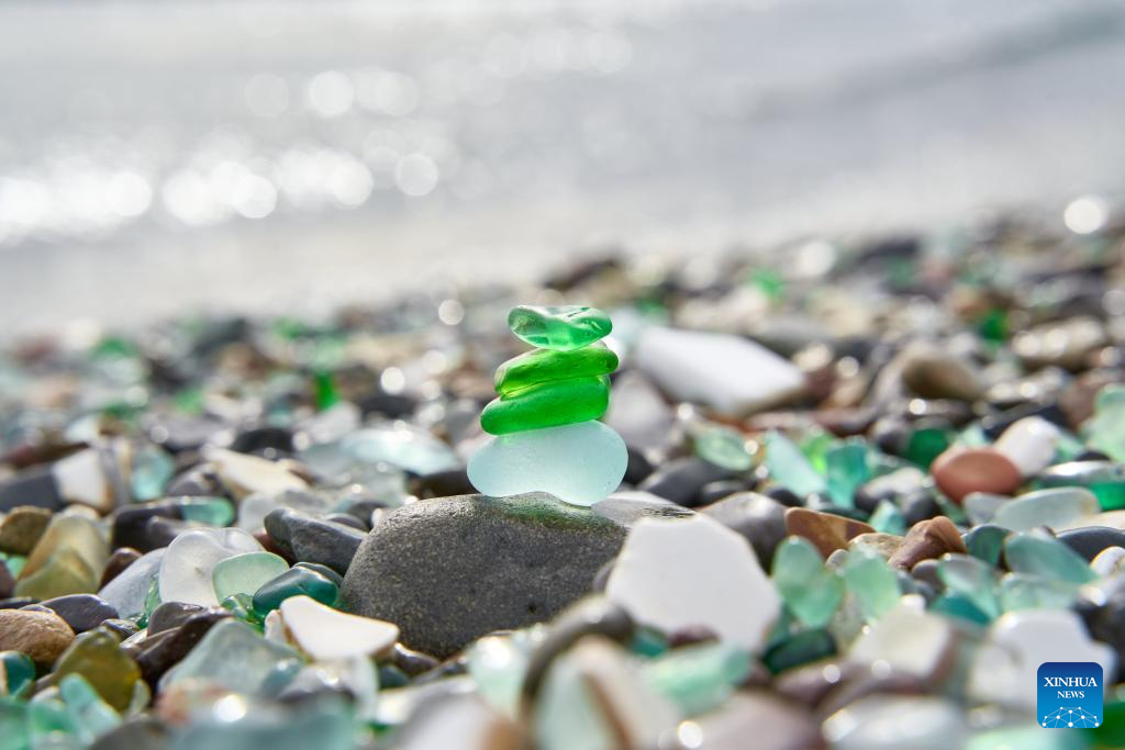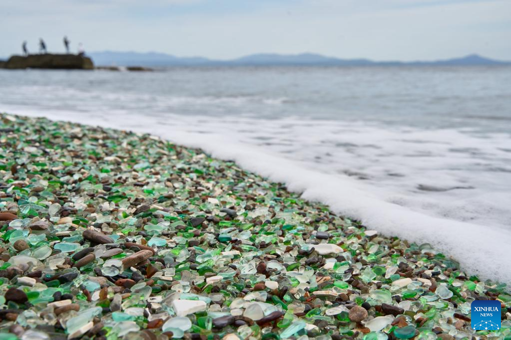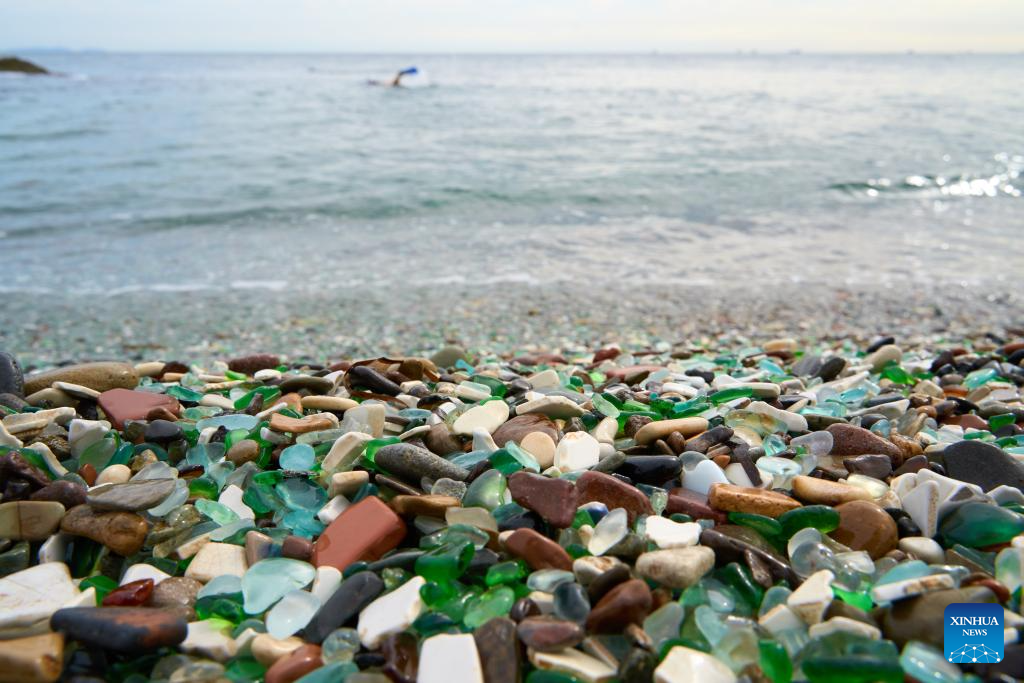This photo taken on Oct. 5, 2025 shows a view of Glass Beach in Vladivostok, Russia. Located in Ussuri Bay on the outskirts of Vladivostok, Glass Beach was once a dumping site for discarded glassware. After decades of being washed by the sea, the glass fragments have been polished into smooth, colorful pebbles, creating a vibrant shoreline that attracts large number of tourists. (Photo by Guo Feizhou/Xinhua)
