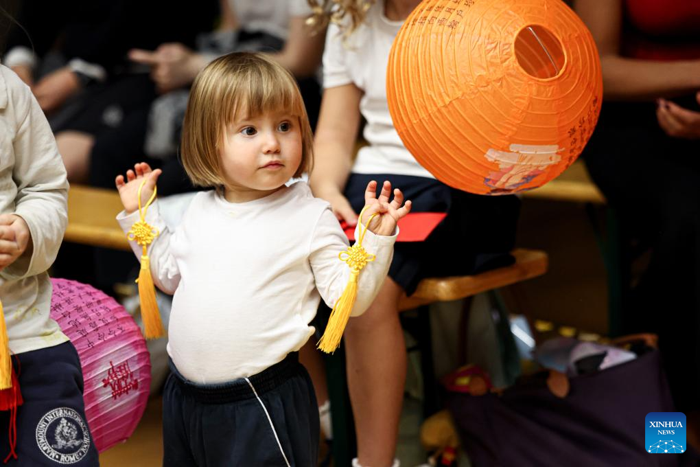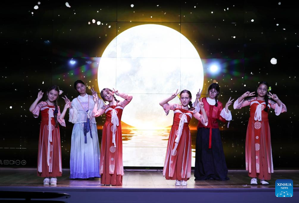 Students perform during a Mid-Autumn-themed funfair at Marymount International School in Rome, Italy, on Oct. 10, 2025. The funfair was held here on Friday, where students and local residents enjoyed a variety of Chinese cultural activities and performances. (Xinhua/Li Jing)