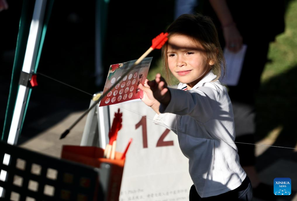 A student plays pitch-pot game during a Mid-Autumn-themed funfair at Marymount International School in Rome, Italy, on Oct. 10, 2025. The funfair was held here on Friday, where students and local residents enjoyed a variety of Chinese cultural activities and performances presented by local enthusiasts of Chinese culture. (Xinhua/Li Jing)