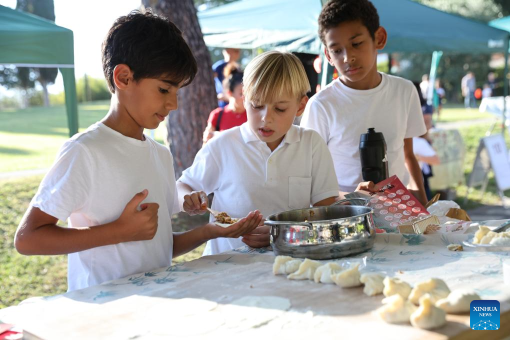 Students make Jiaozi, or Chinese dumplings, during a Mid-Autumn-themed funfair at Marymount International School in Rome, Italy, on Oct. 10, 2025. The funfair was held here on Friday, where students and local residents enjoyed a variety of Chinese cultural activities and performances presented by local enthusiasts of Chinese culture. (Xinhua/Li Jing)
