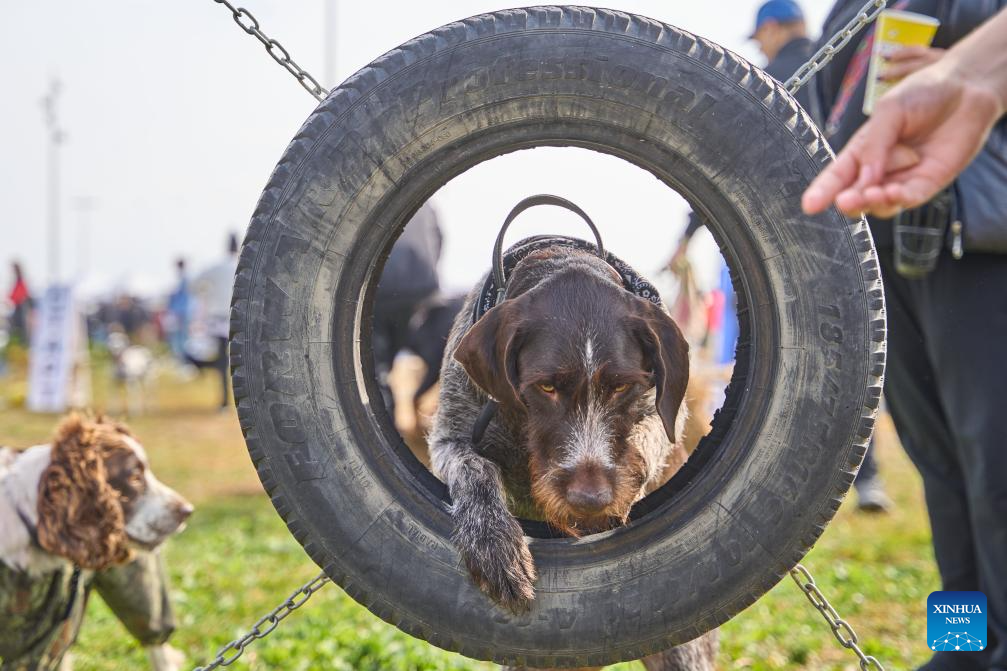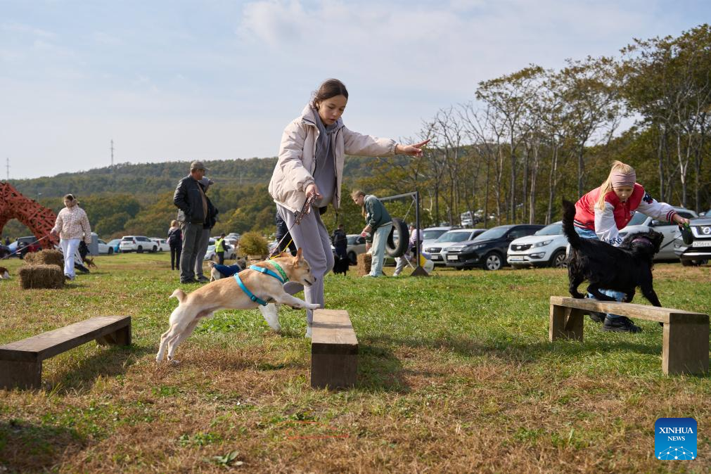 Dogs participate in a hurdle race during a dog carnival in Vladivostok, Russia, Oct. 12, 2025. The Russian city of Vladivostok held a dog carnival at Akhlyostyshev Beach on Sunday, featuring pet skill shows, a costume show, and fun competitions. The event attracted many residents to take part with their pet dogs. (Photo by Guo Feizhou/Xinhua)