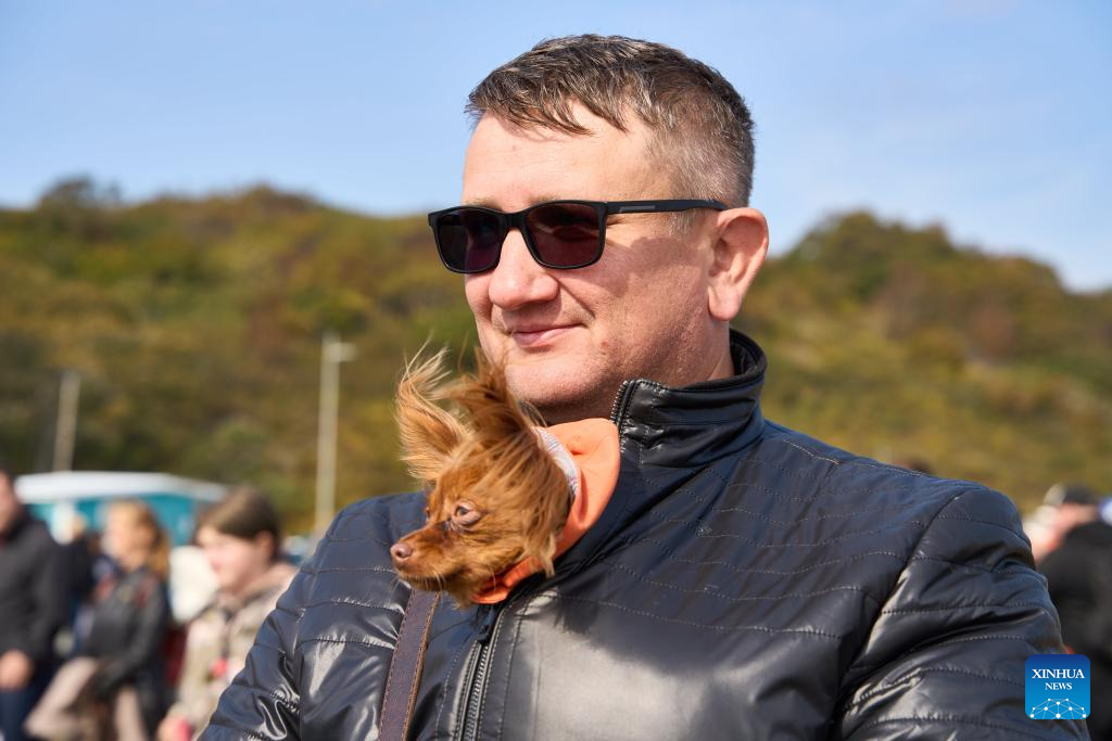 A man is pictured with his dog during a dog carnival in Vladivostok, Russia, Oct. 12, 2025. The Russian city of Vladivostok held a dog carnival at Akhlyostyshev Beach on Sunday, featuring pet skill shows, a costume show, and fun competitions. The event attracted many residents to take part with their pet dogs. (Photo by Guo Feizhou/Xinhua)