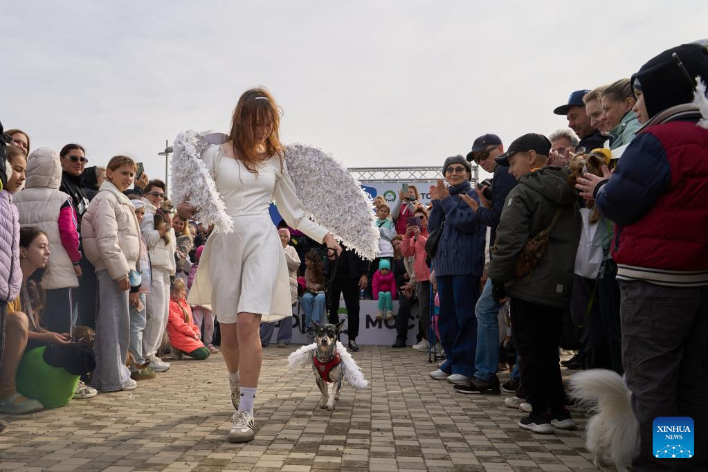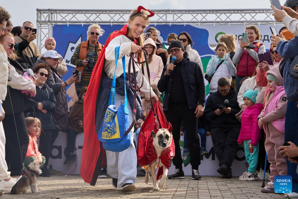 A woman and her dog participate in a costume show during a dog carnival in Vladivostok, Russia, Oct. 12, 2025. The Russian city of Vladivostok held a dog carnival at Akhlyostyshev Beach on Sunday, featuring pet skill shows, a costume show, and fun competitions. The event attracted many residents to take part with their pet dogs. (Photo by Guo Feizhou/Xinhua)