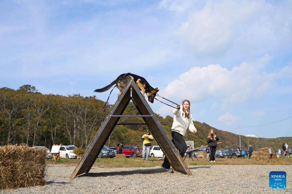 A dog participates in an obstacle course during a dog carnival in Vladivostok, Russia, Oct. 12, 2025. The Russian city of Vladivostok held a dog carnival at Akhlyostyshev Beach on Sunday, featuring pet skill shows, a costume show, and fun competitions. The event attracted many residents to take part with their pet dogs. (Photo by Guo Feizhou/Xinhua)