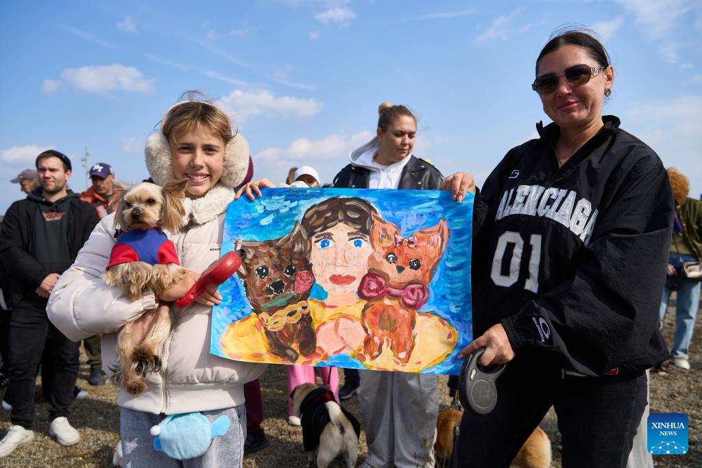 A mother and a daughter present a painting with a dog during a dog carnival in Vladivostok, Russia, Oct. 12, 2025. The Russian city of Vladivostok held a dog carnival at Akhlyostyshev Beach on Sunday, featuring pet skill shows, a costume show, and fun competitions. The event attracted many residents to take part with their pet dogs. (Photo by Guo Feizhou/Xinhua)