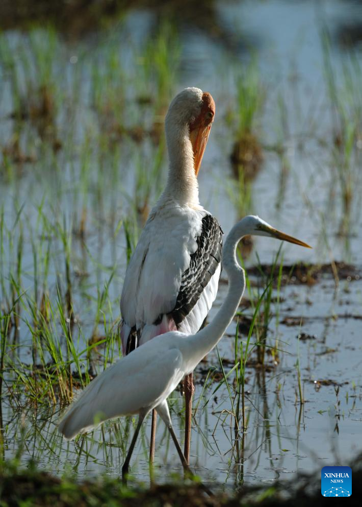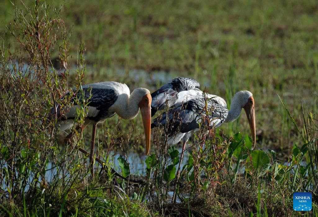 Painted storks are seen in a wetland park in Kotte, Sri Lanka, on Oct. 13, 2025. (Photo by Ajith Perera/Xinhua)
