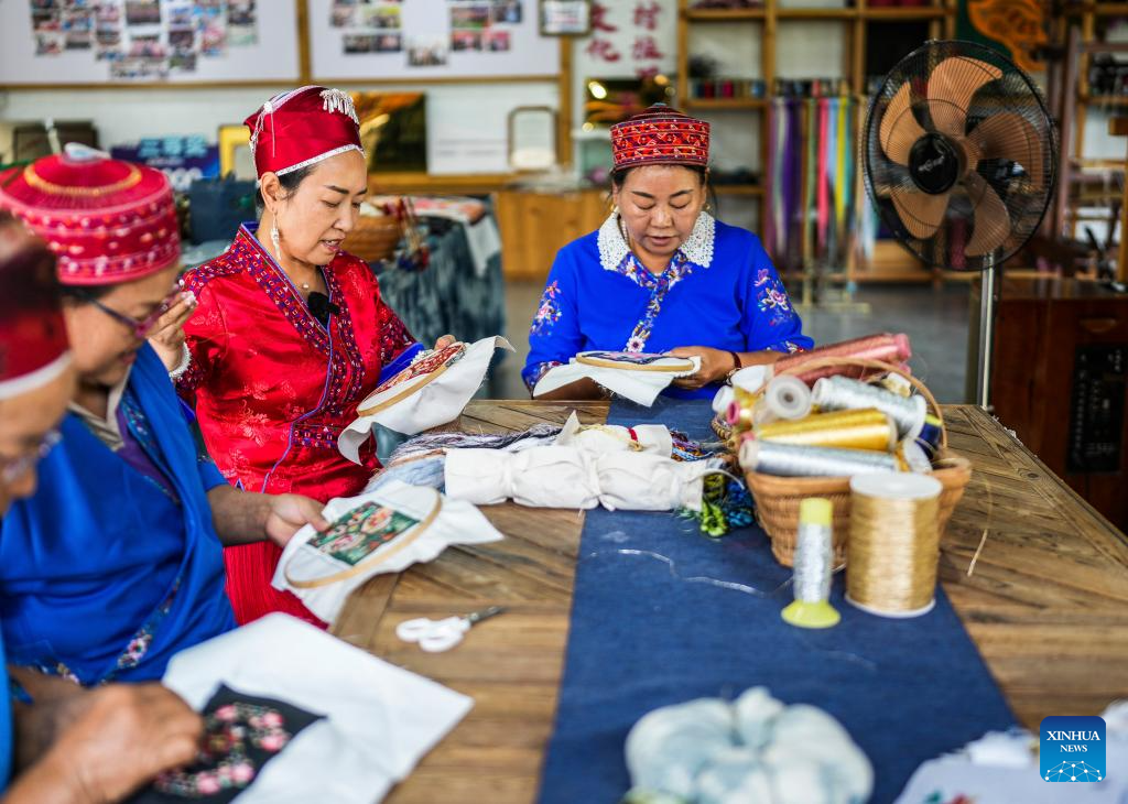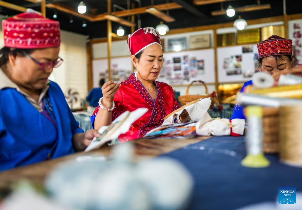 Over the years, Long Luying has provided free training in embroidery techniques to local women, creating job opportunities for more than 1,200 rural women in the village. (Xinhua/Tao Liang)