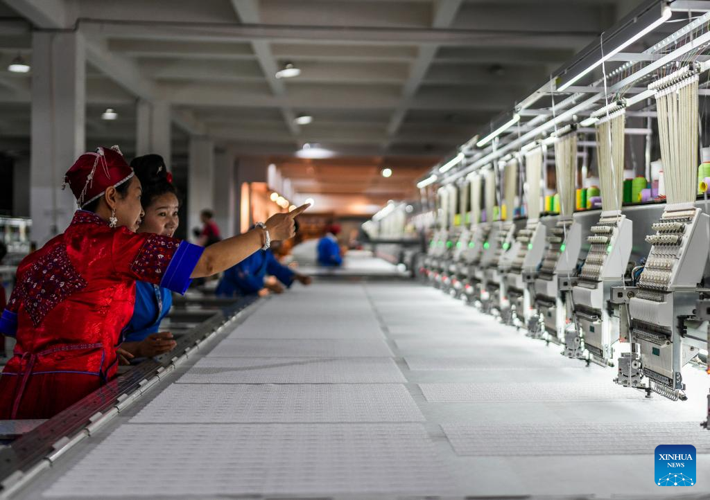Long Luying guides her employees in their embroidery creation at the workshop in Shibing County of Qiandongnan Miao and Dong Autonomous Prefecture, southwest China's Guizhou Province, Oct. 10, 2025.