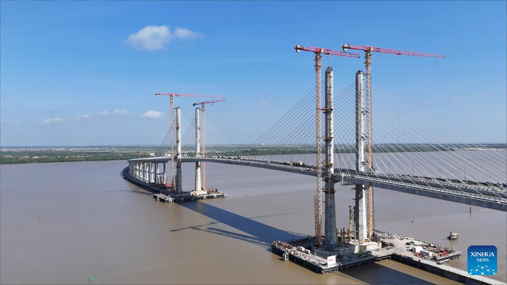 An aerial drone photo taken on Sept. 25, 2025 shows the new Demerara River Bridge under construction in Guyana. (China Railway Construction Corporation/Handout via Xinhua)