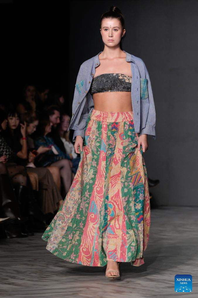A model presents a creation of ANAHATAU during the Spring/Summer 2026 Collections Fashion Show at Vancouver Fashion Week in Vancouver, British Columbia, Canada, Oct. 15, 2025. (Photo by Liang Sen/Xinhua)