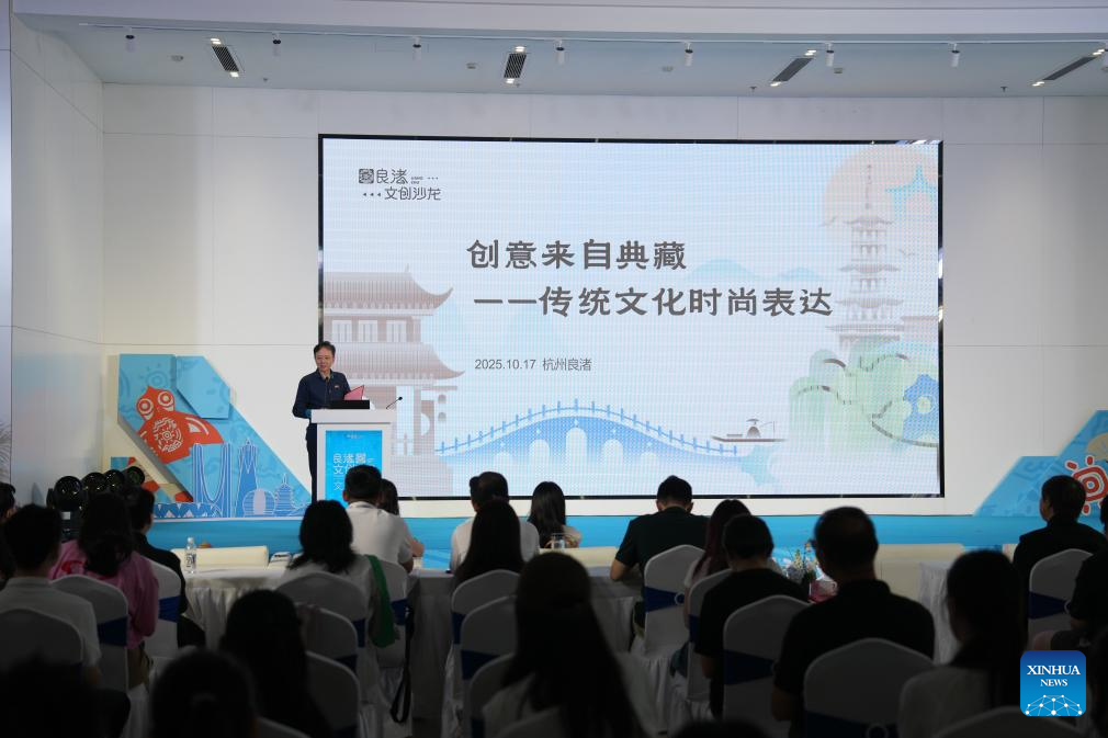 A guest delivers a speech at a salon event during Liangzhu Cultural and Creative Bazaar in Hangzhou, east China's Zhejiang Province, Oct. 17, 2025. The bazaar opened here on Friday. It features activities such as exhibitions, panel discussions and fashion shows, showcasing cultural and creative achievements from China and abroad. (Xinhua/Huang Zongzhi)