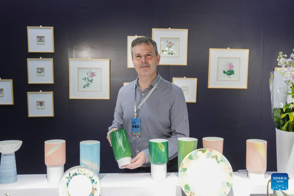 An exhibitor from England shows a porcelain piece at Liangzhu Cultural and Creative Bazaar in Hangzhou, east China's Zhejiang Province, Oct. 17, 2025. The bazaar opened here on Friday. It features activities such as exhibitions, panel discussions and fashion shows, showcasing cultural and creative achievements from China and abroad. (Xinhua/Huang Zongzhi)