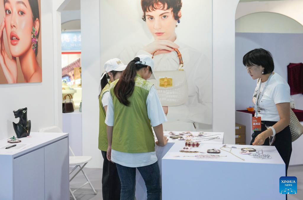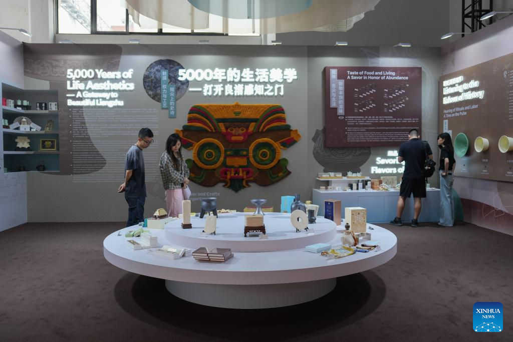 People view cultural and creative products at Liangzhu Cultural and Creative Bazaar in Hangzhou, east China's Zhejiang Province, Oct. 17, 2025. The bazaar opened here on Friday. It features activities such as exhibitions, panel discussions and fashion shows, showcasing cultural and creative achievements from China and abroad. (Xinhua/Huang Zongzhi)