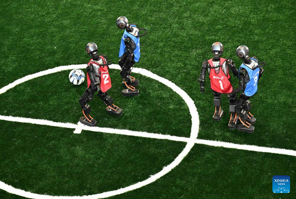 Robots are pictured during a football game at the International Convention and Exhibition Center in Shijiazhuang, north China's Hebei Province, Oct. 17, 2025. The 2025 China Robot Competition and RoboCup China Open are held here from Friday to Sunday. (Xinhua/Yang Shiyao)