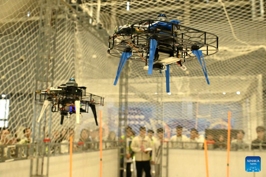 A drone challenge competition is held at the International Convention and Exhibition Center in Shijiazhuang, north China's Hebei Province, Oct. 17, 2025. The 2025 China Robot Competition and RoboCup China Open are held here from Friday to Sunday. (Photo by Chen Qibao/Xinhua)