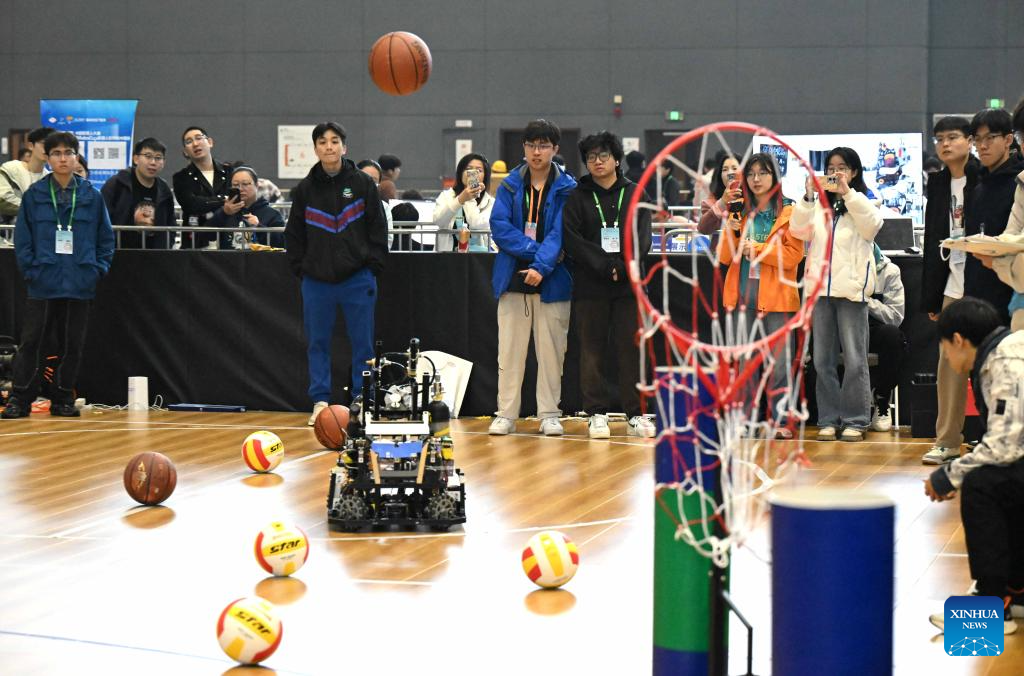 A robot competes during a basketball game at the International Convention and Exhibition Center in Shijiazhuang, north China's Hebei Province, Oct. 17, 2025. The 2025 China Robot Competition and RoboCup China Open are held here from Friday to Sunday. (Photo by Chen Qibao/Xinhua)