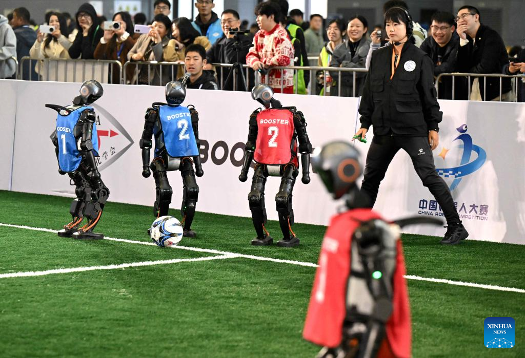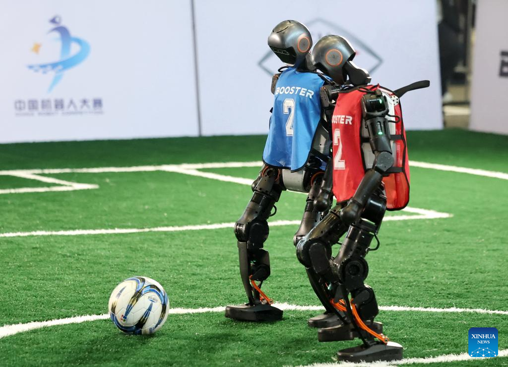 Robots are pictured during a football game at the International Convention and Exhibition Center in Shijiazhuang, north China's Hebei Province, Oct. 17, 2025. The 2025 China Robot Competition and RoboCup China Open are held here from Friday to Sunday. (Photo by Chen Qibao/Xinhua)