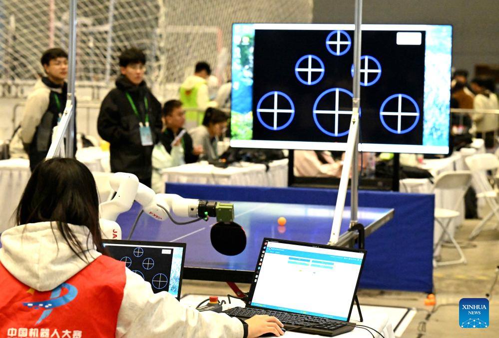 A robot competes during a table tennis game at the International Convention and Exhibition Center in Shijiazhuang, north China's Hebei Province, Oct. 17, 2025. The 2025 China Robot Competition and RoboCup China Open are held here from Friday to Sunday. (Photo by Chen Qibao/Xinhua)